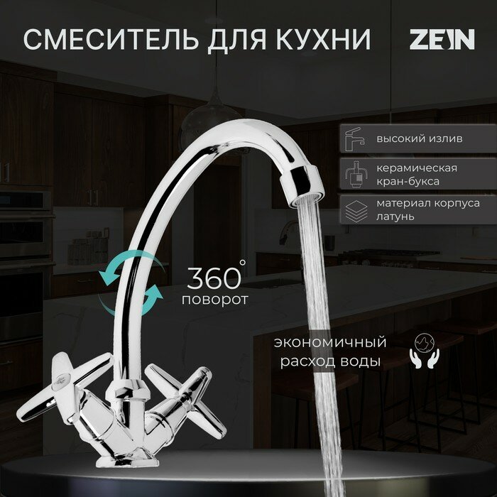 Смеситель для кухни ZEIN ZC2021, кран-букса латунь 1/2", без подводки, хром (1 шт.)
