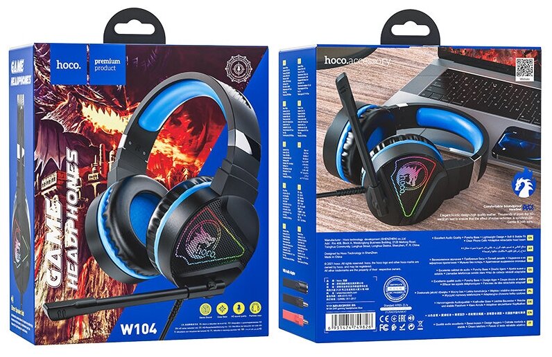 Проводные наушники W104, HOCO, игровые с микрофоном, черные с синим
