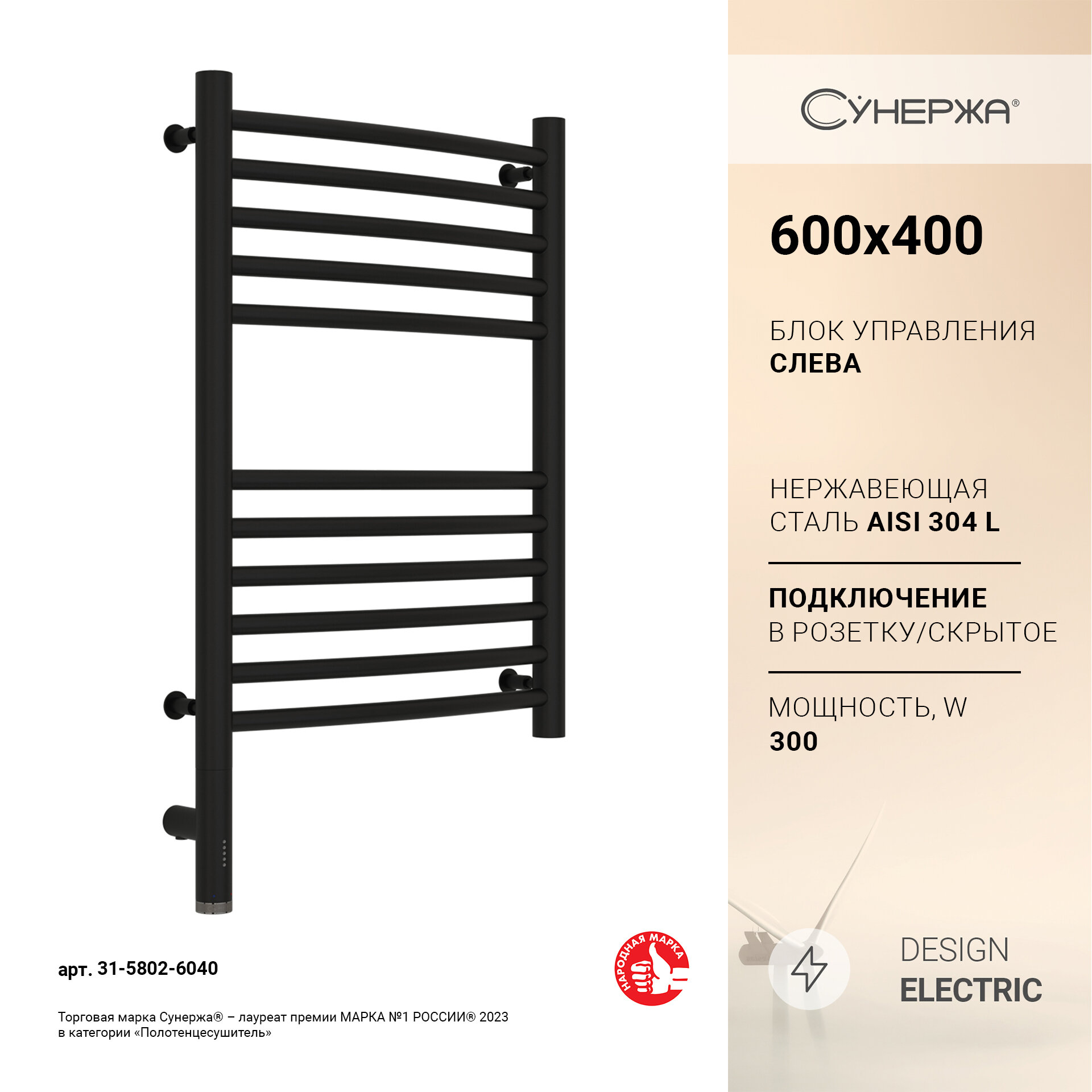 Полотенцесушитель электрический Сунержа Богема 3.0 выгнутая, 600x400, МЭМ левый, матовый чёрный 31-5802-6040