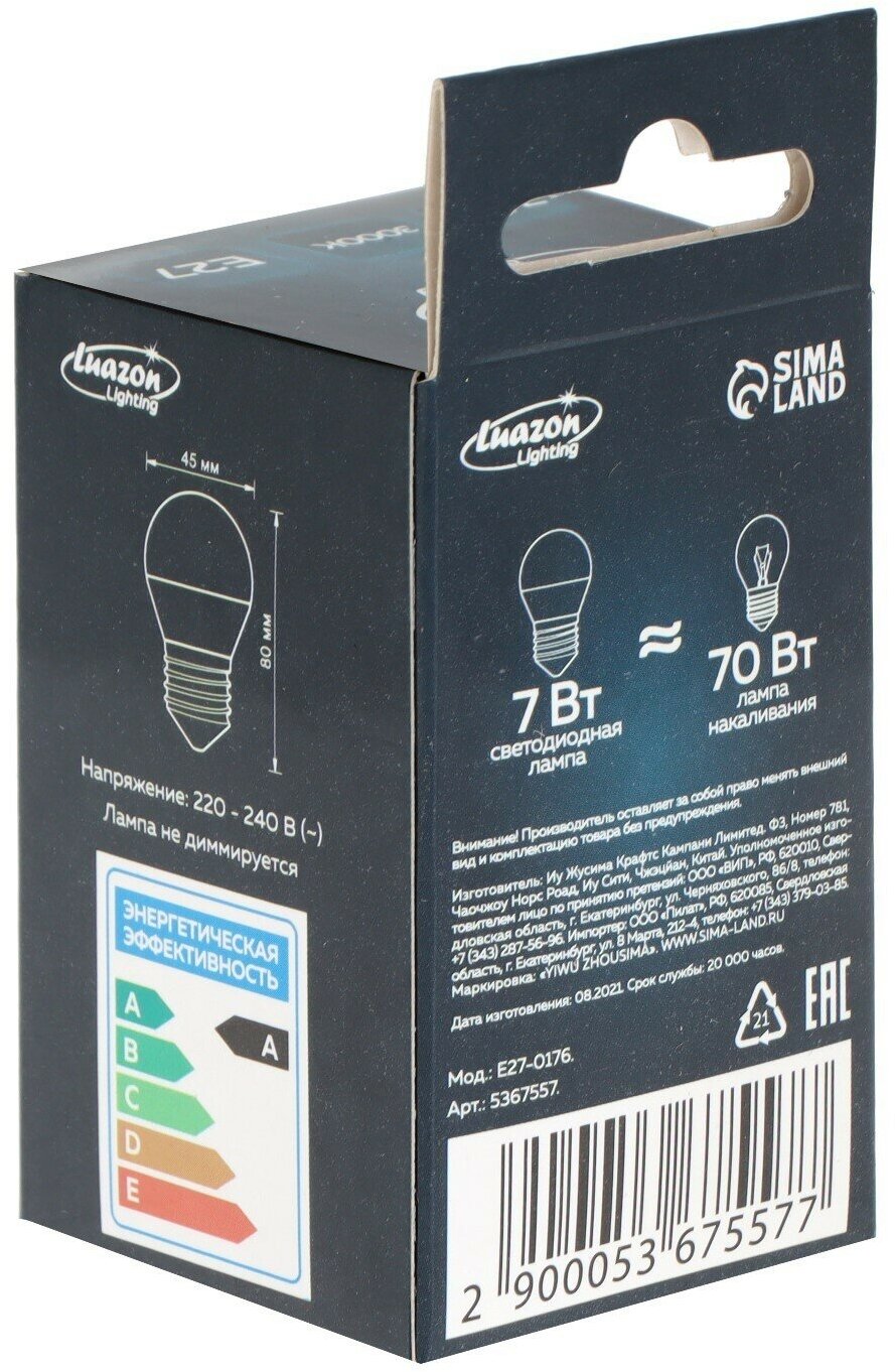 Лампа cветодиодная Luazon Lighting, G45, 7 Вт, E27, 630 Лм, 3000 K, теплый белый./В упаковке шт: 1