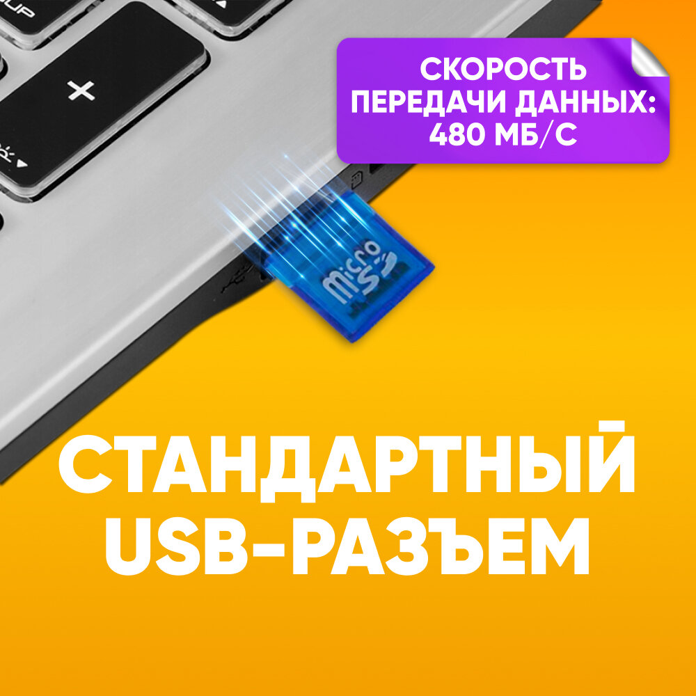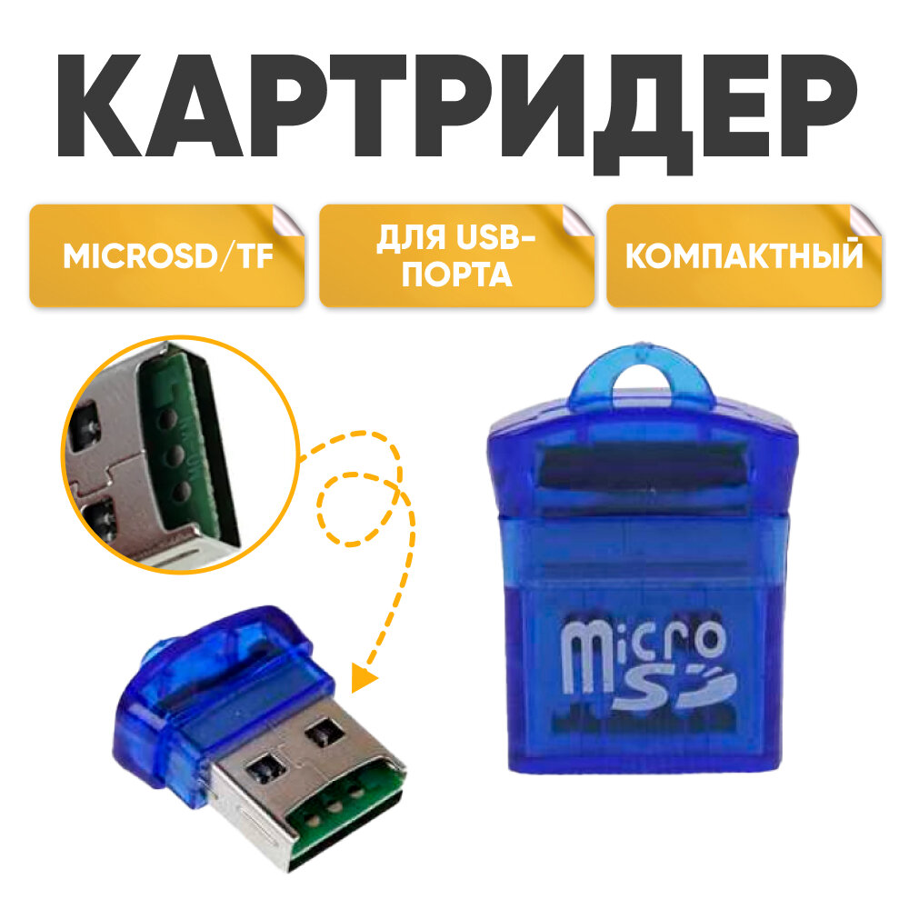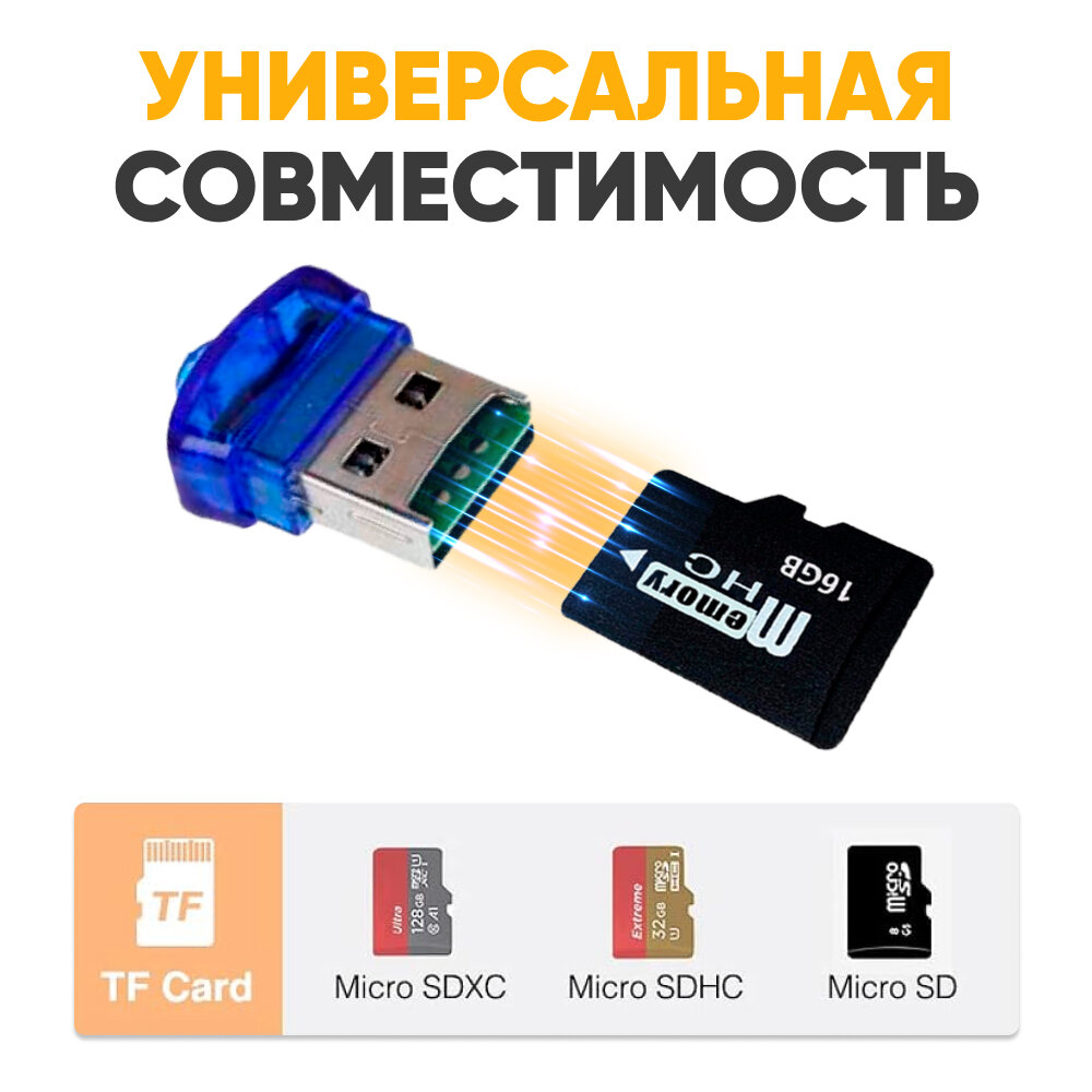 Картридер microSD TF01, sd карта памяти синий, адаптер для ноутбуков микросд, переходник для компьютеров микро сд, для USB-порта, кард ридер