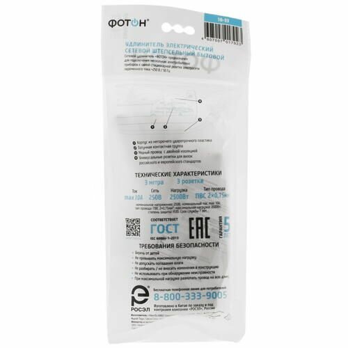 Удлинитель сетевой "фотон" 10-33, 3м, 3 розетки, белый, ГОСТ