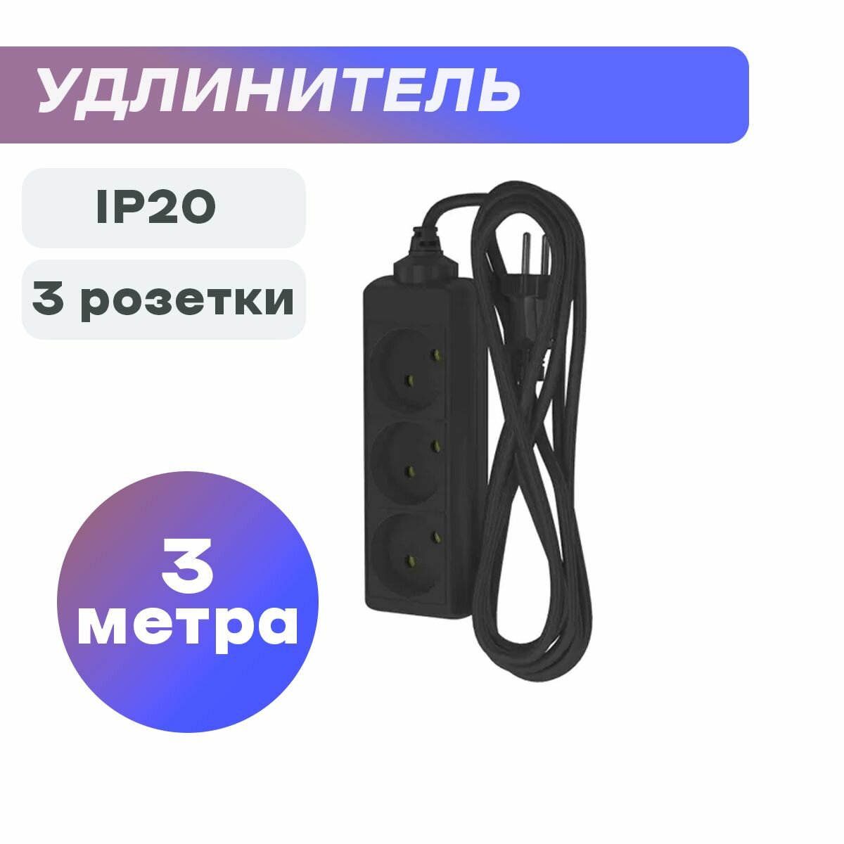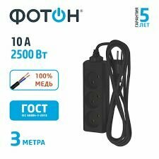 Удлинитель сетевой для розетки фотон 10А 3м 3 розетки черный, ГОСТ