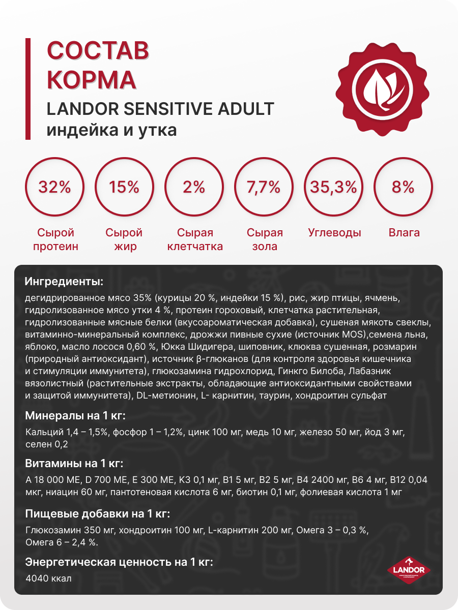 | Состав | Дегидрированное мясо 35% (курицы 20 %, индейки 15 %), рис, жир птицы, ячмень, гидролизованное мясо утки 4 %, протеин гороховый, клетчатка растительная, гидролизованные мясные белки (вкусоароматическая добавка), сушеная мякоть свеклы, витаминно-минеральный комплекс, дрожжи пивные сухие (источник MOS), cемена льна, яблоко, масло лосося 0,60 %, Юкка Шидигера, шиповник, клюква сушенная, розмарин (природный антиоксидант), источник β-глюканов (для контроля здоровья кишечника и стимуляции иммунитета), глюкозамина гидрохлорид, Гинкго Билоба, Лабазник вязолистный (растительные экстракты, обладающие мощными антиоксидантными свойствами и защитой иммунитета), DL-метионин, L- карнитин, таурин, хондроитин сульфат. |