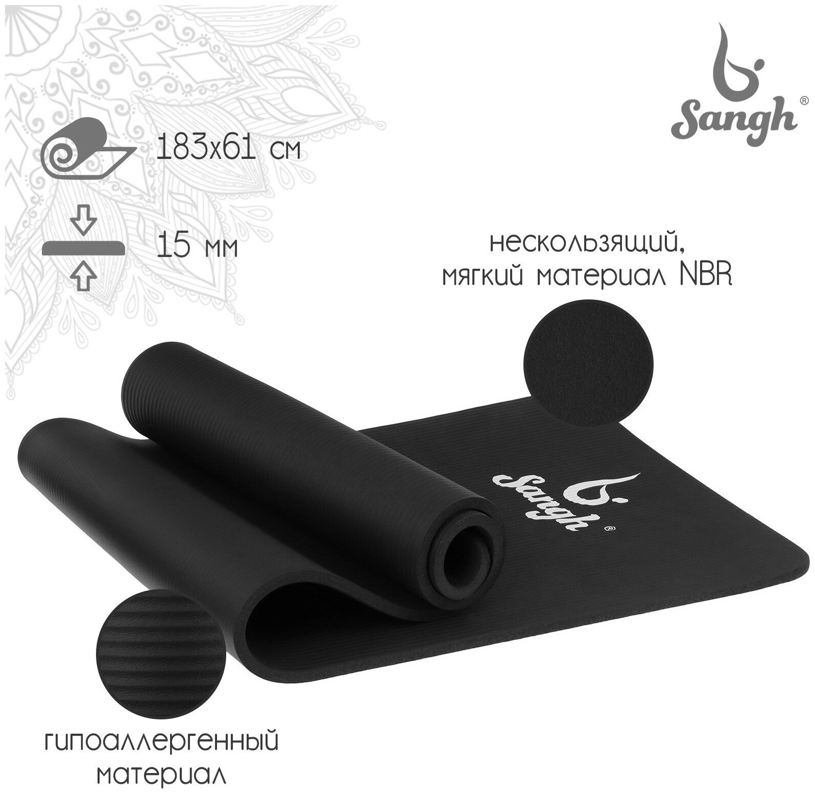 Коврик Sangh, для йоги, размер 183 х 61 х 1,5 см, цвет чёрный