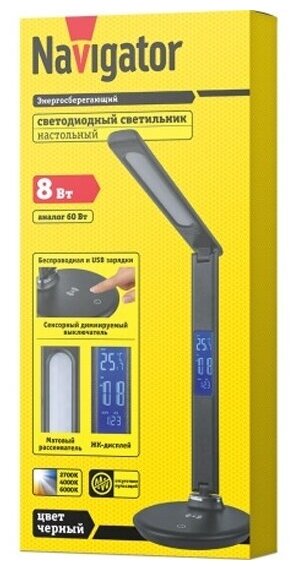 Светильник светодиодный 80 322 NDF-D044-8W-MK-BL-LED 8Вт 2700/4000/6000К 300лм настольный сенсор USB ЖК дисплей (дата/время/будильник/температура) на основании черн. Navigator 80322