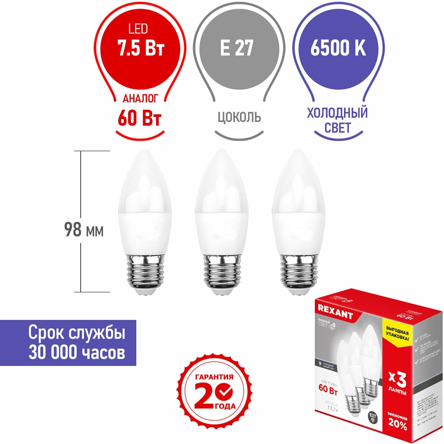 Светодиодная лампа Rexant Свеча E27, 7.5 Вт, 713 Лм (=60 Вт), 6500 K (холодный свет), упаковка 3 шт.