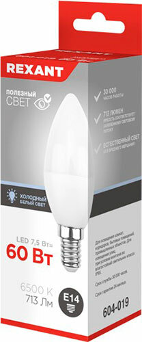 Лампа светодиодная REXANT 604-017 / 604-019, E14, 7.5 Вт, 6500 К