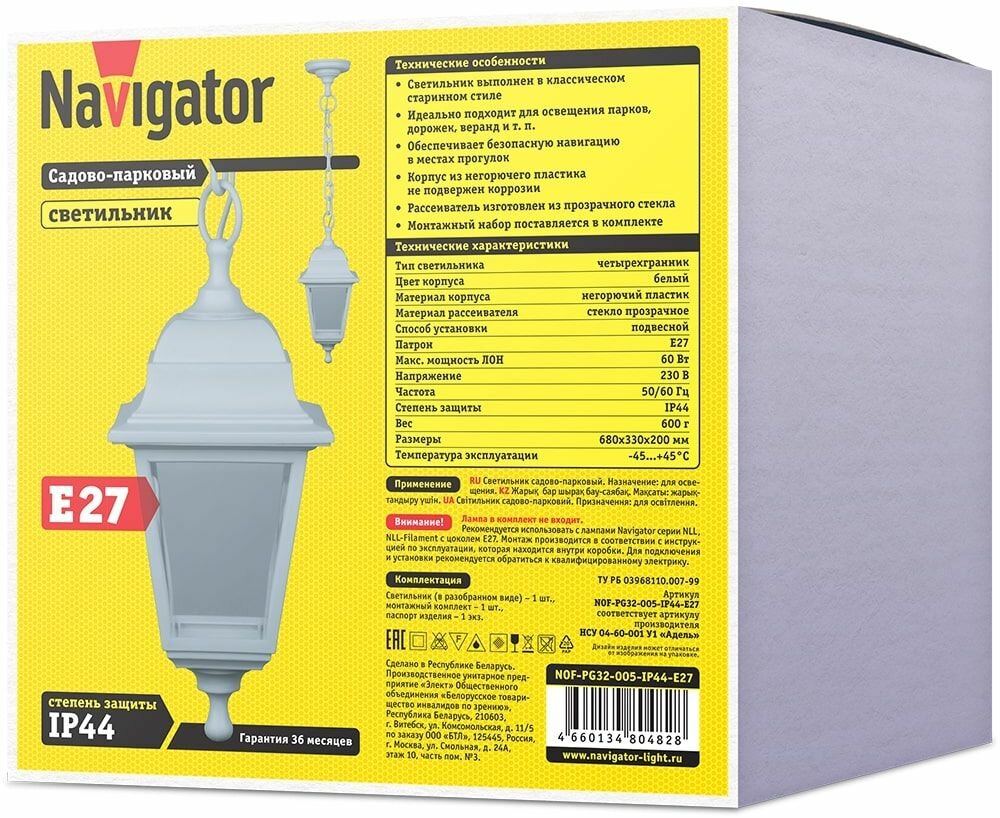 Светильник садовый подвесной Navigator 80 482, 4 грани, белый, IP44, цоколь E27