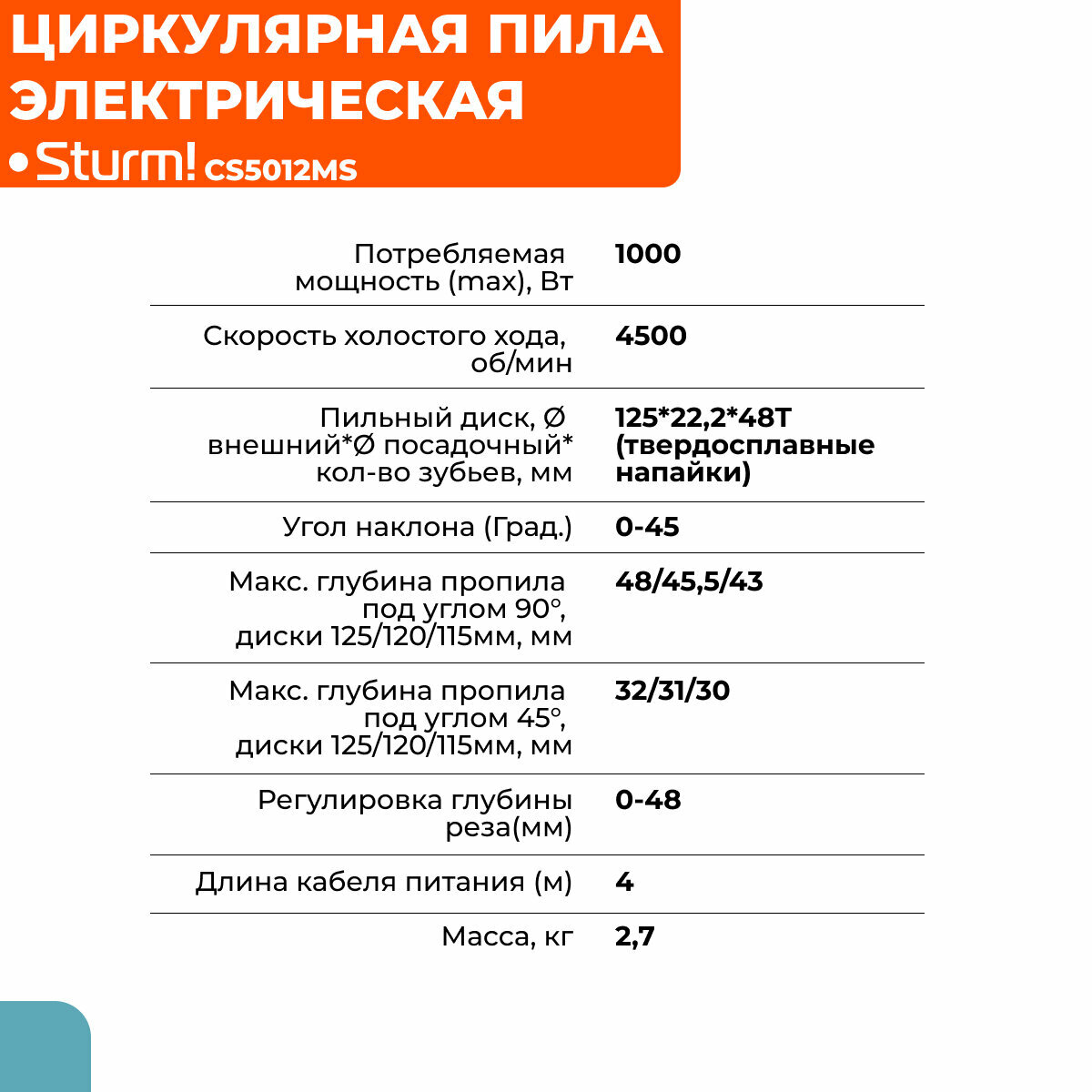 Sturm! Cs5012ms Пила минициркулярная 1000Вт, ТПД 125х22.2мм, пропил 48мм, Sturm!