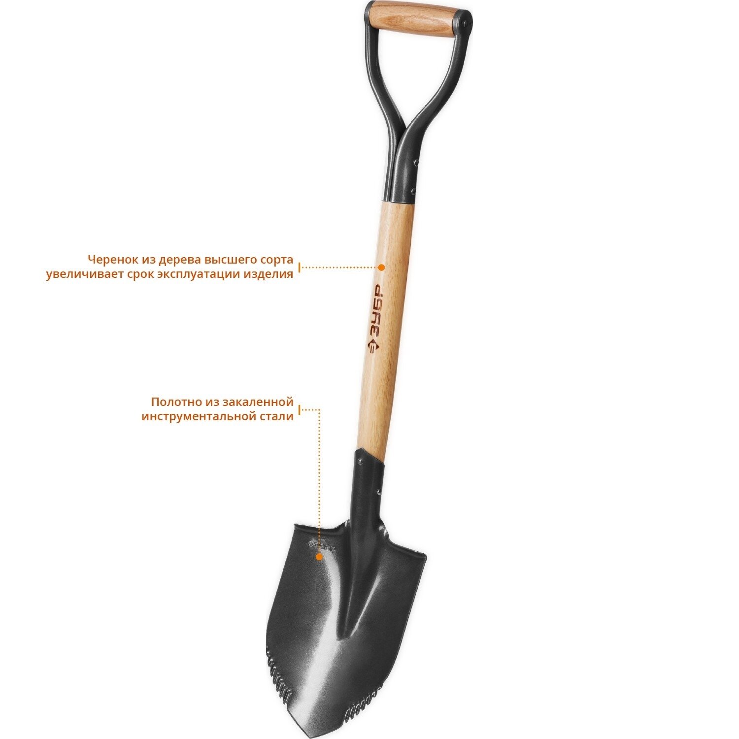 ЗУБР Беркут, 228х173х800мм, полотно 1.6мм с зубцами, закалено, дерев.черенок высш. сорт с рукояткой, автомобильная лопата, профессионал(4-39506)