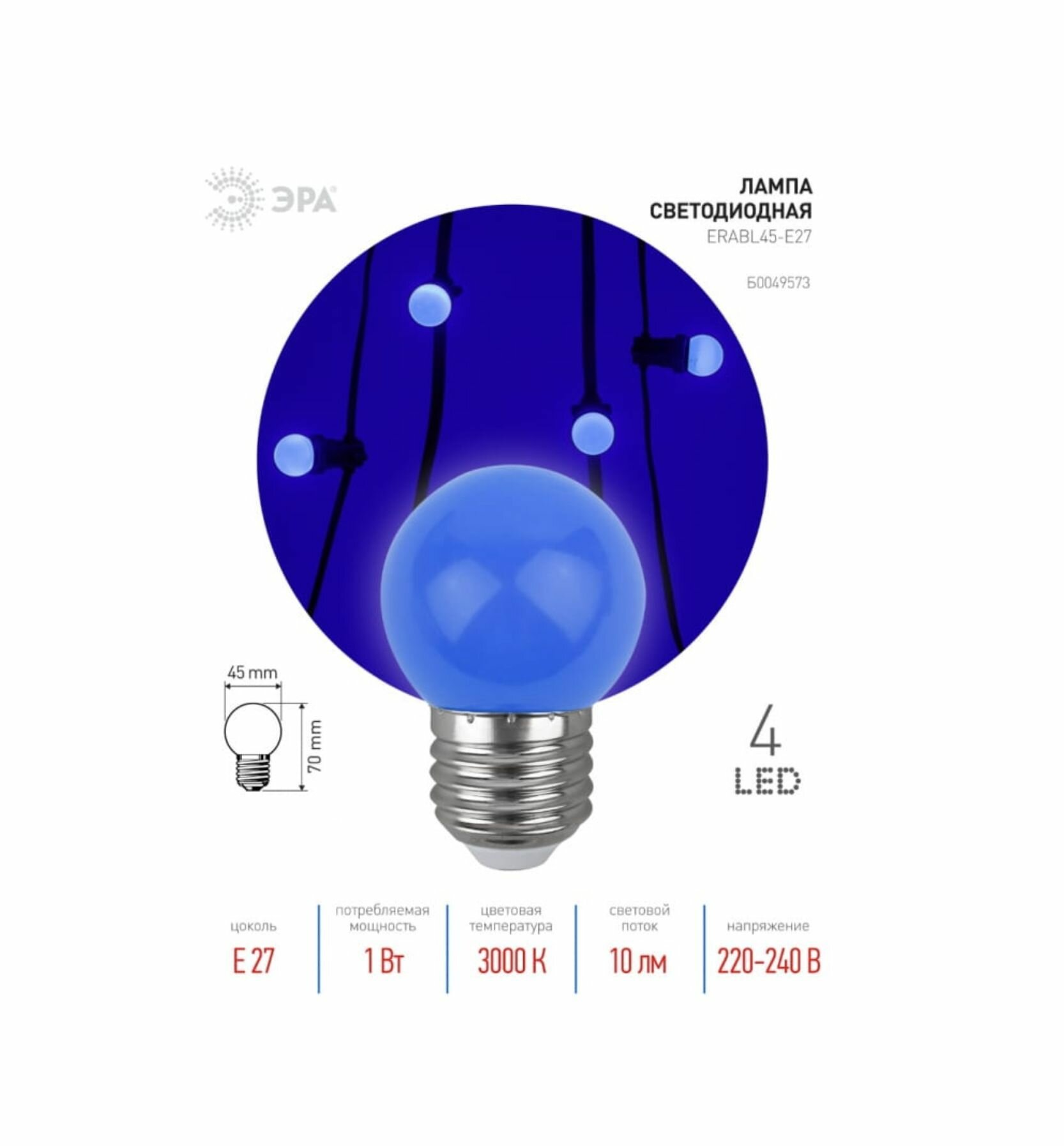 ЭРА Лампа св/д д/гирлянды Белт Лайт шар Р45 E27 1W(10Lm) 3000K, синий, 70х45, 4SMD ERABL45-E27 9659 (арт. 768386)