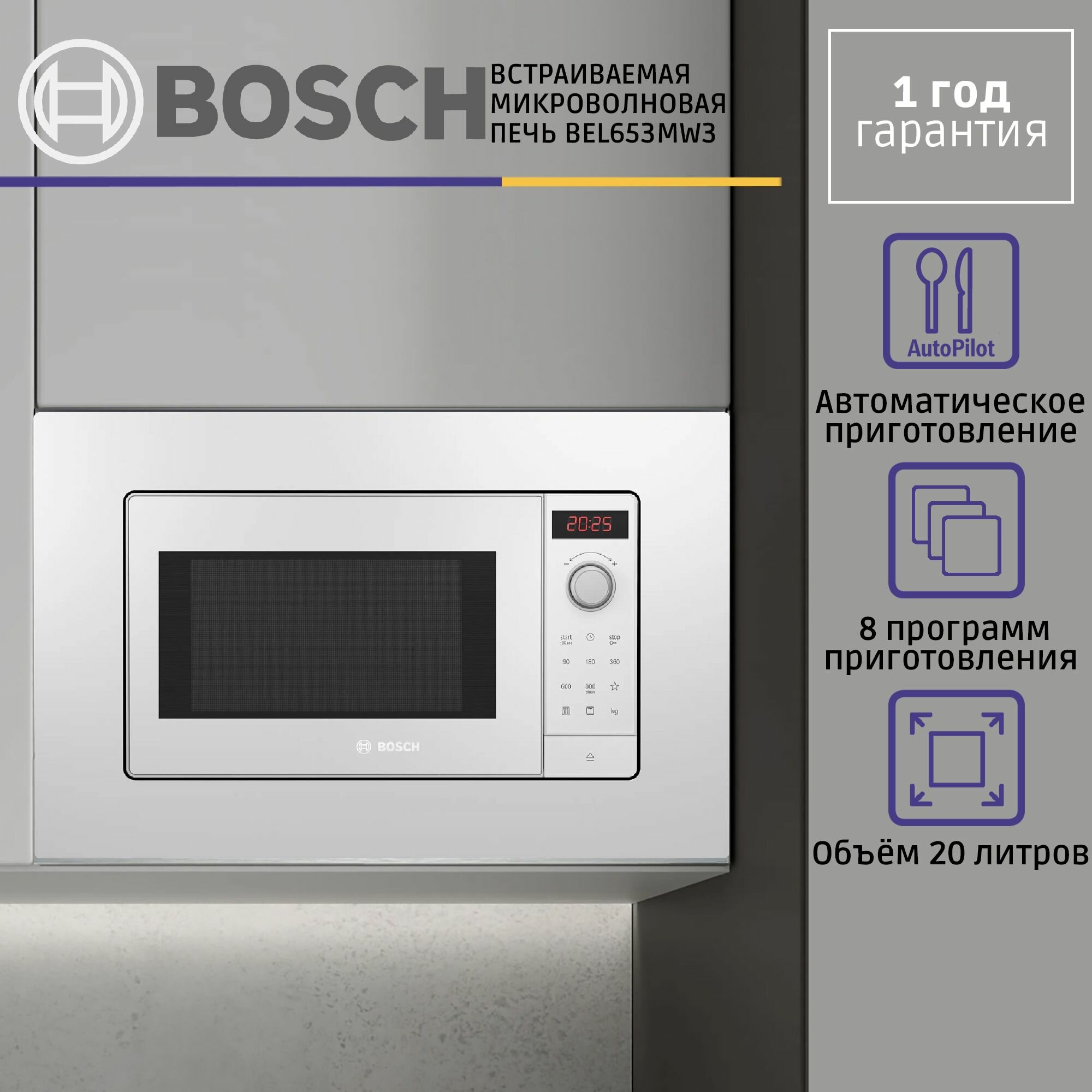 Микроволновая печь Bosch BEL653MW3, встраиваемая, 25л, 800Вт, белый
