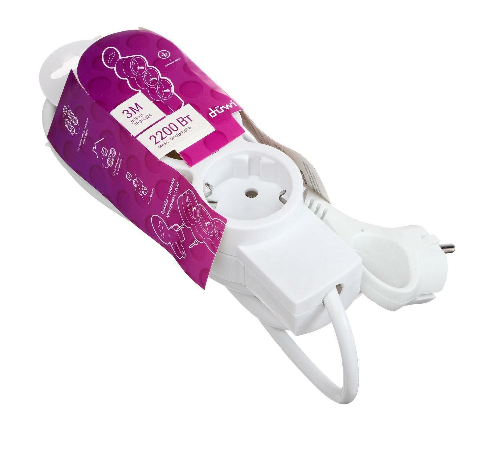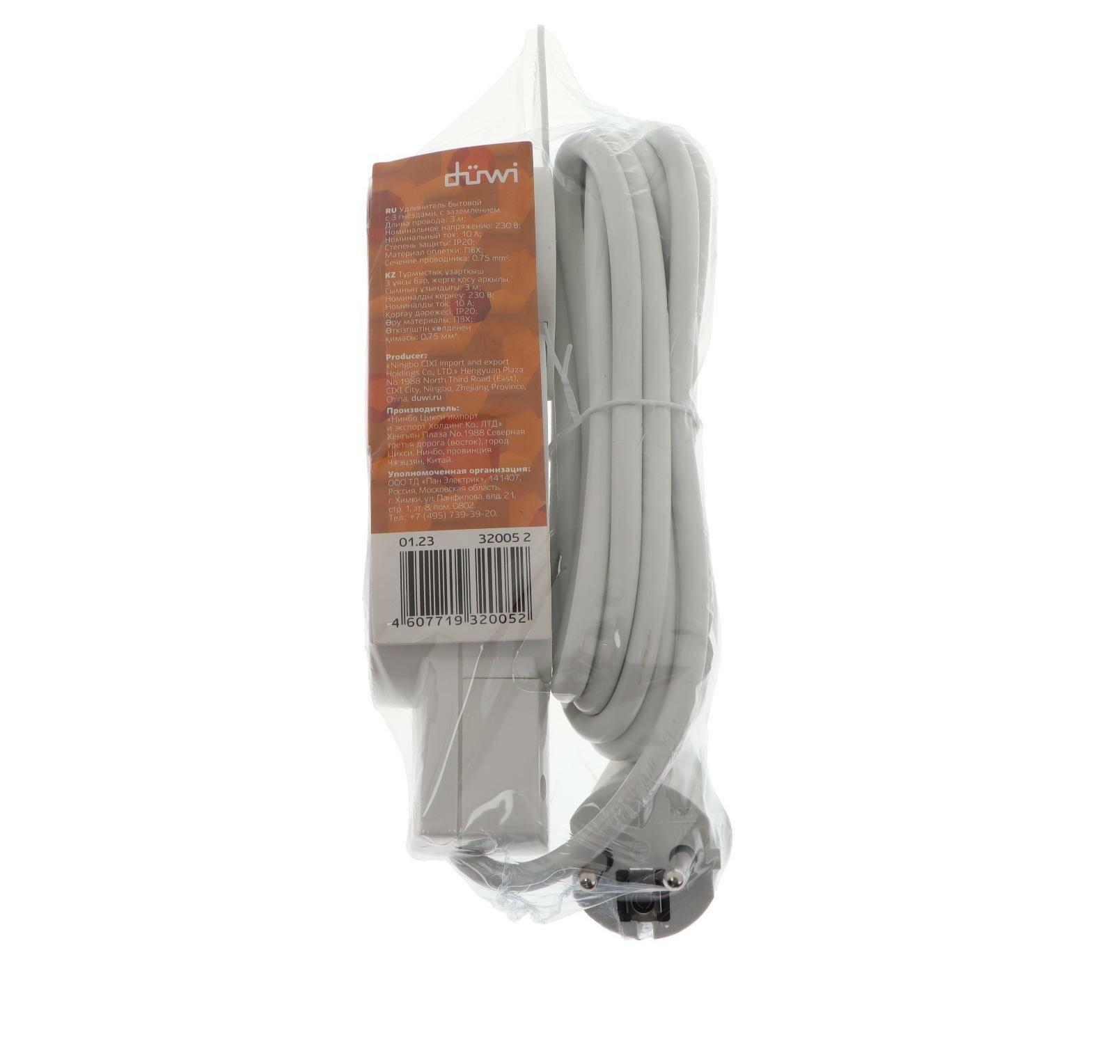 Удлинитель Duwi, 3 розетки, 3 м, 10 А, 2200 Вт, ПВС 3х0.75 мм2, с з/к, белый (1 шт.)