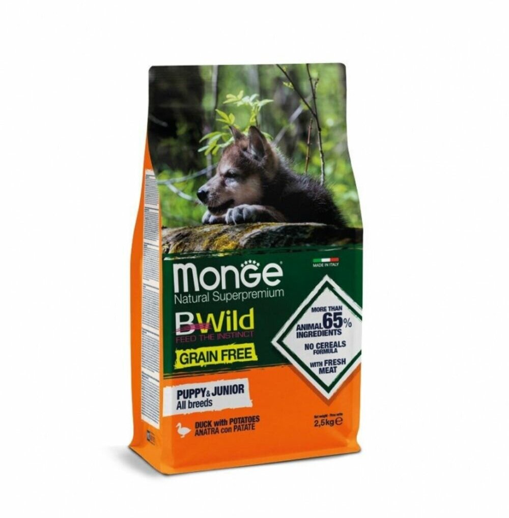 MONGE BWILD GRAIN FREE PUPPY DUCK беззерновой для щенков всех пород с уткой и картофелем (2,5 кг)