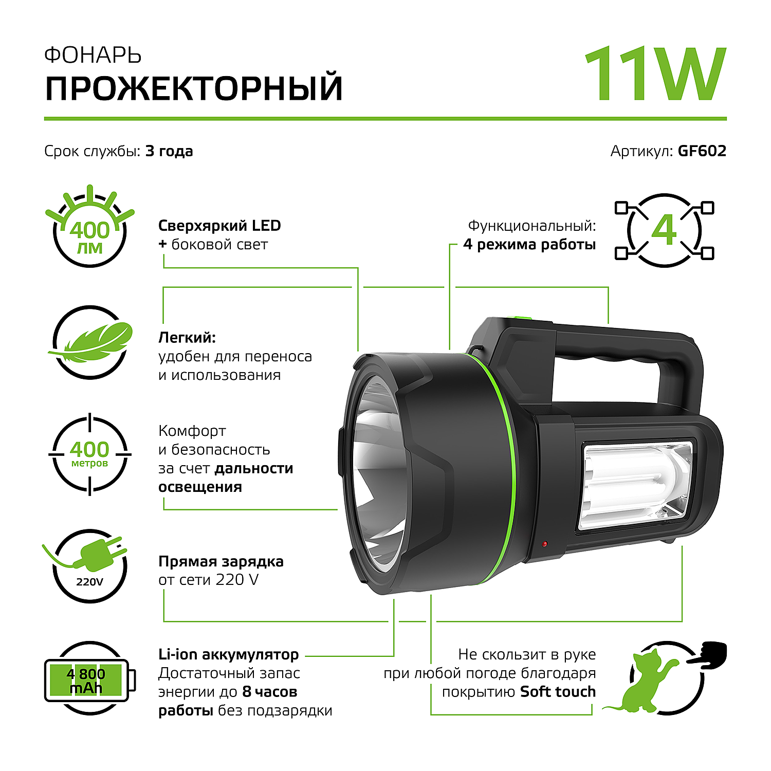 Фонарь прожекторный модель GFL602 11W 400lm Li-ion 4800mAh LED 1/10/30 GF602 .