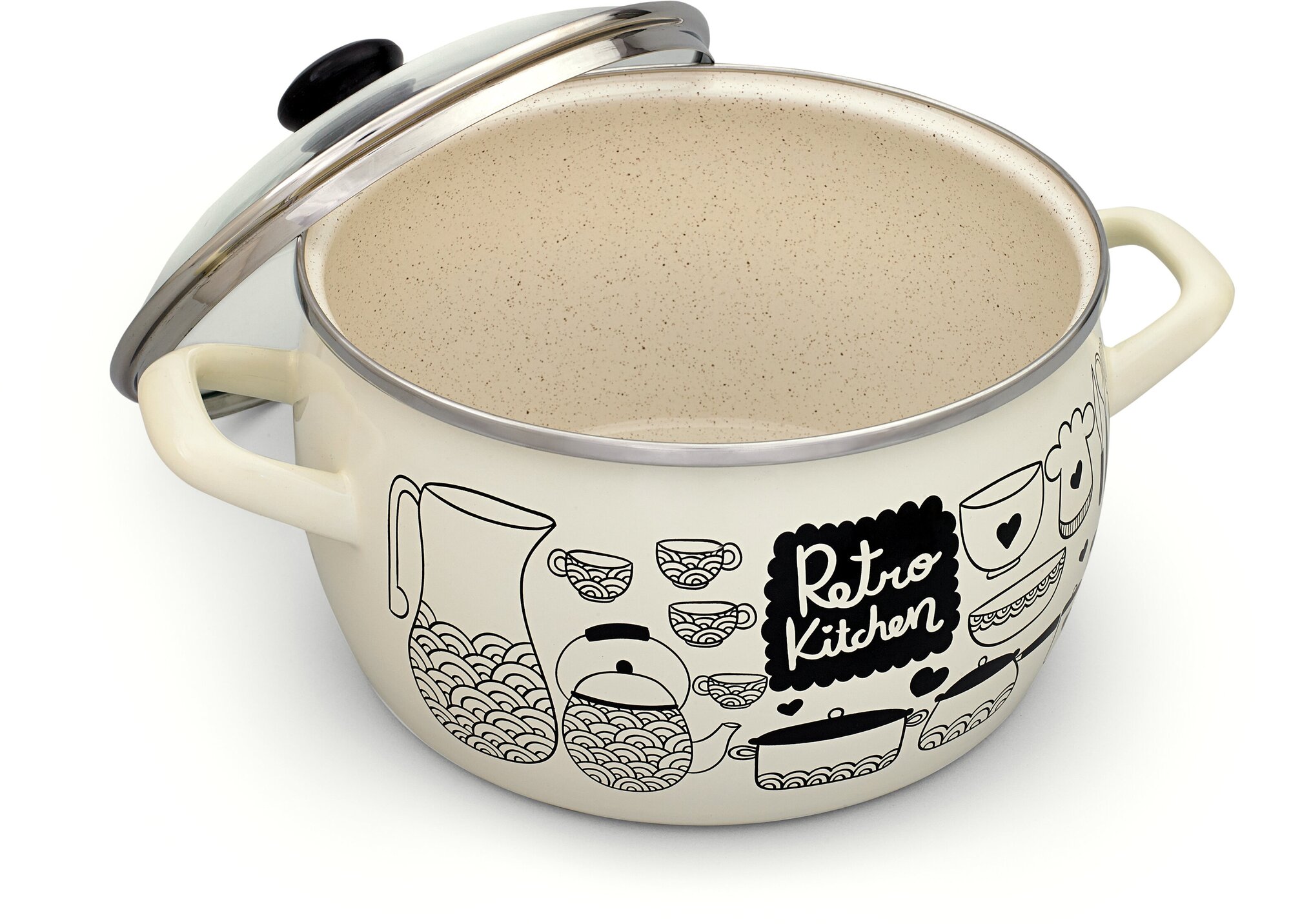Кастрюля эмалированная из стали Metrot / Метрот Ретро, объемом 3.3л со стеклянной крышкой, для всех видов плит / посуда для кухни