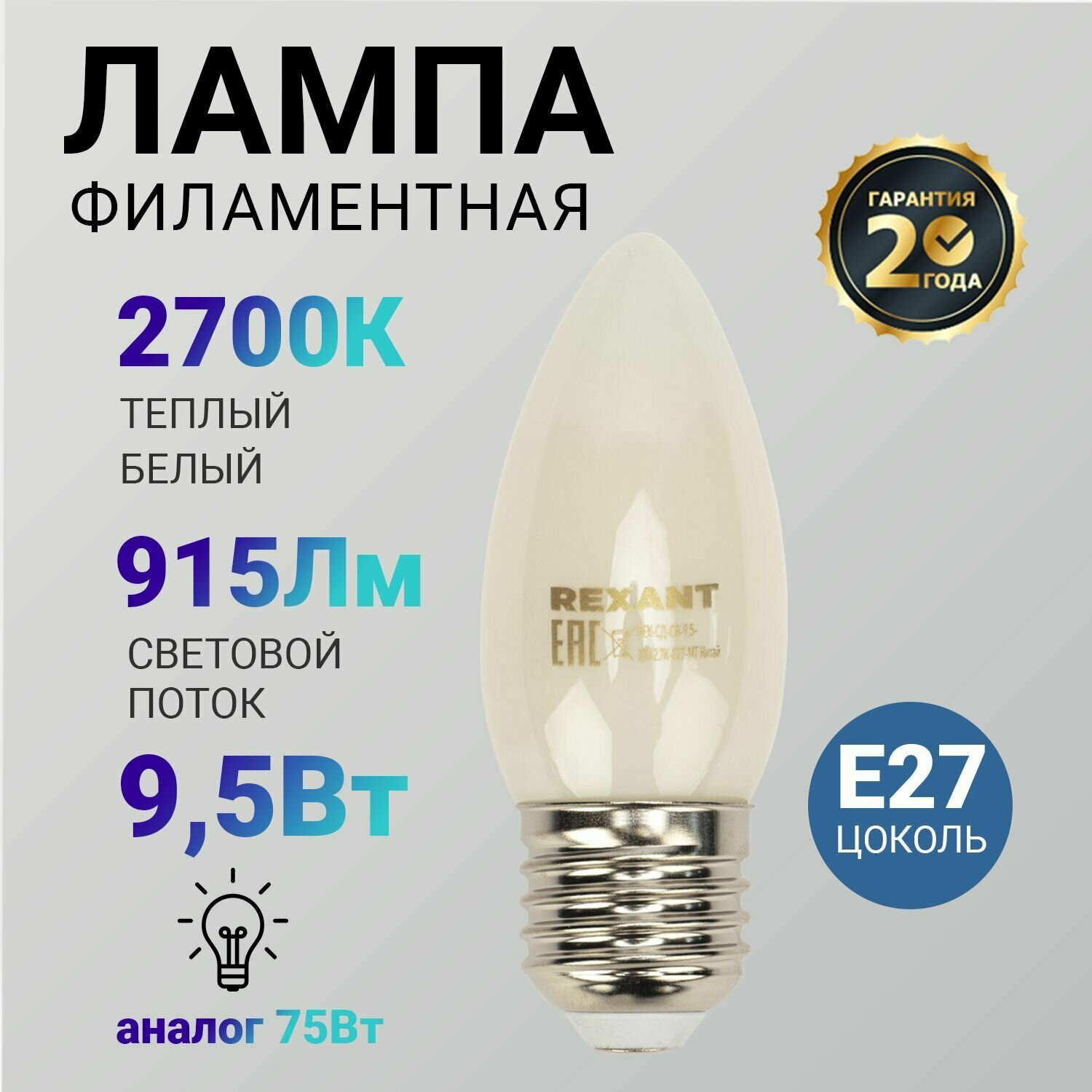 Лампа филаментная REXANT Свеча CN35, 9.5 Вт, 915 Лм, 2700K, E27 в матовой колбе