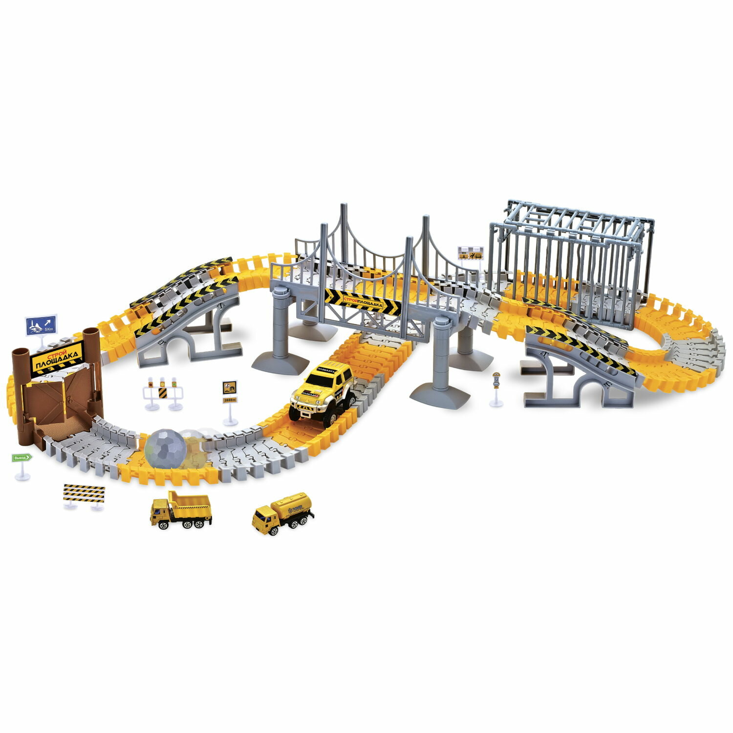 1toy гибкий трек "Стройплощадка"179 дет, ворота, мост, туннель, , шарик, 2 мет.маш.+1 маш. на бат.