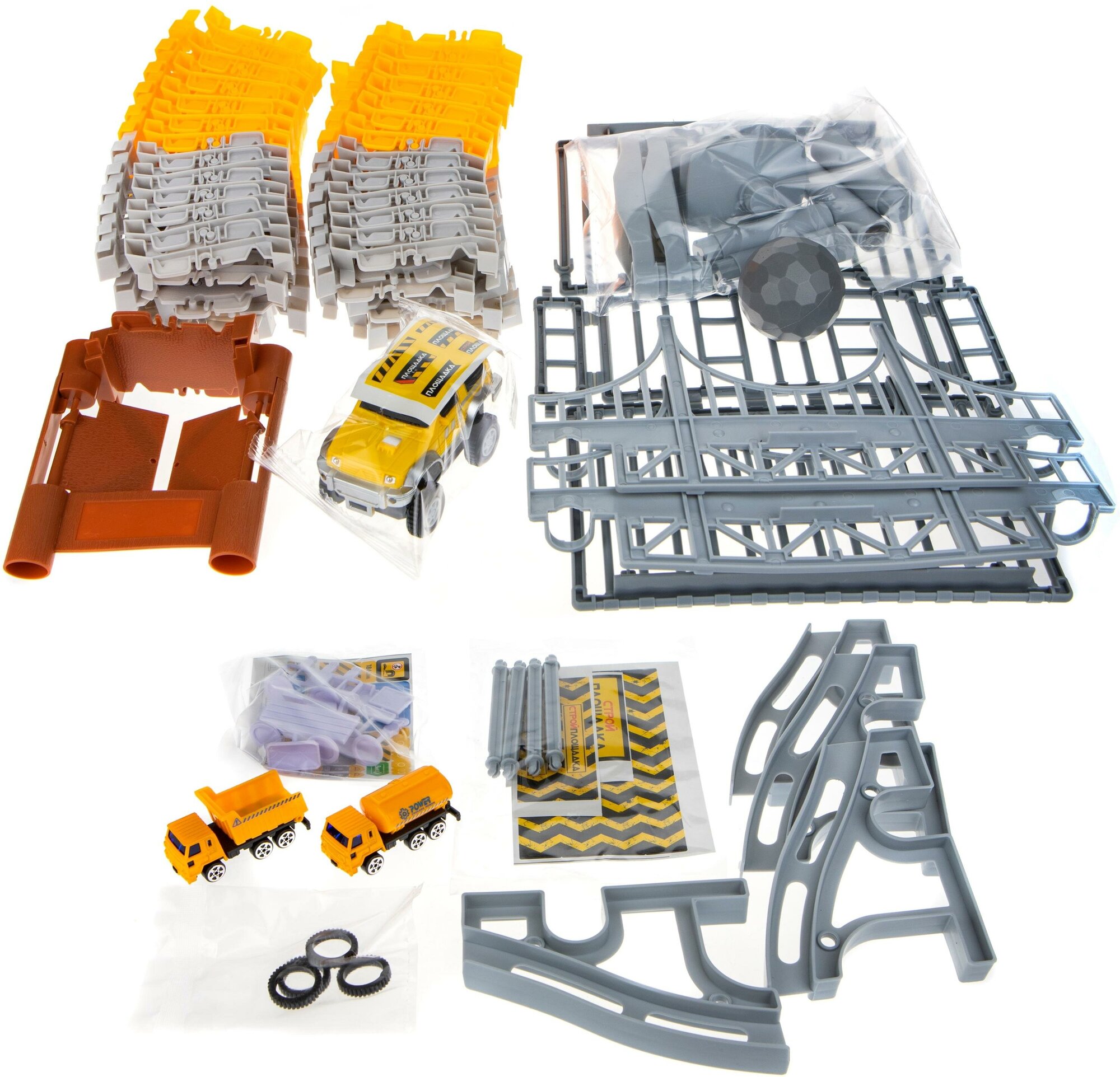 | Комплектация | детали для трека, джип, 2 дополнительные машинки строительной техники, ворота, мост, камень, дорожные знаки |