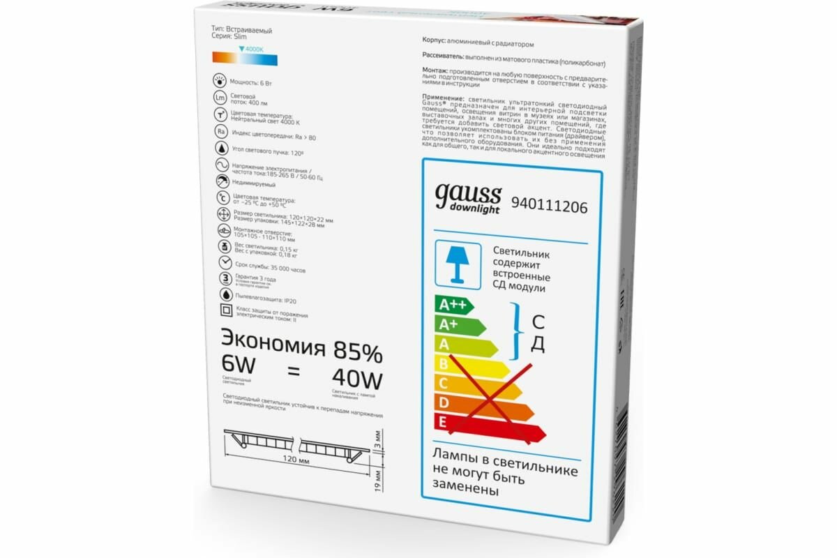 Светильник Gauss Slim квадрат 6W 400lm 4000K 180-265V IP20 монтаж Ø105*105 120*120*22 LED 1/20