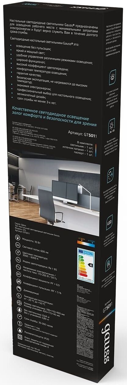 Лампа офисная светодиодная gauss GTL501, 10 Вт, черный