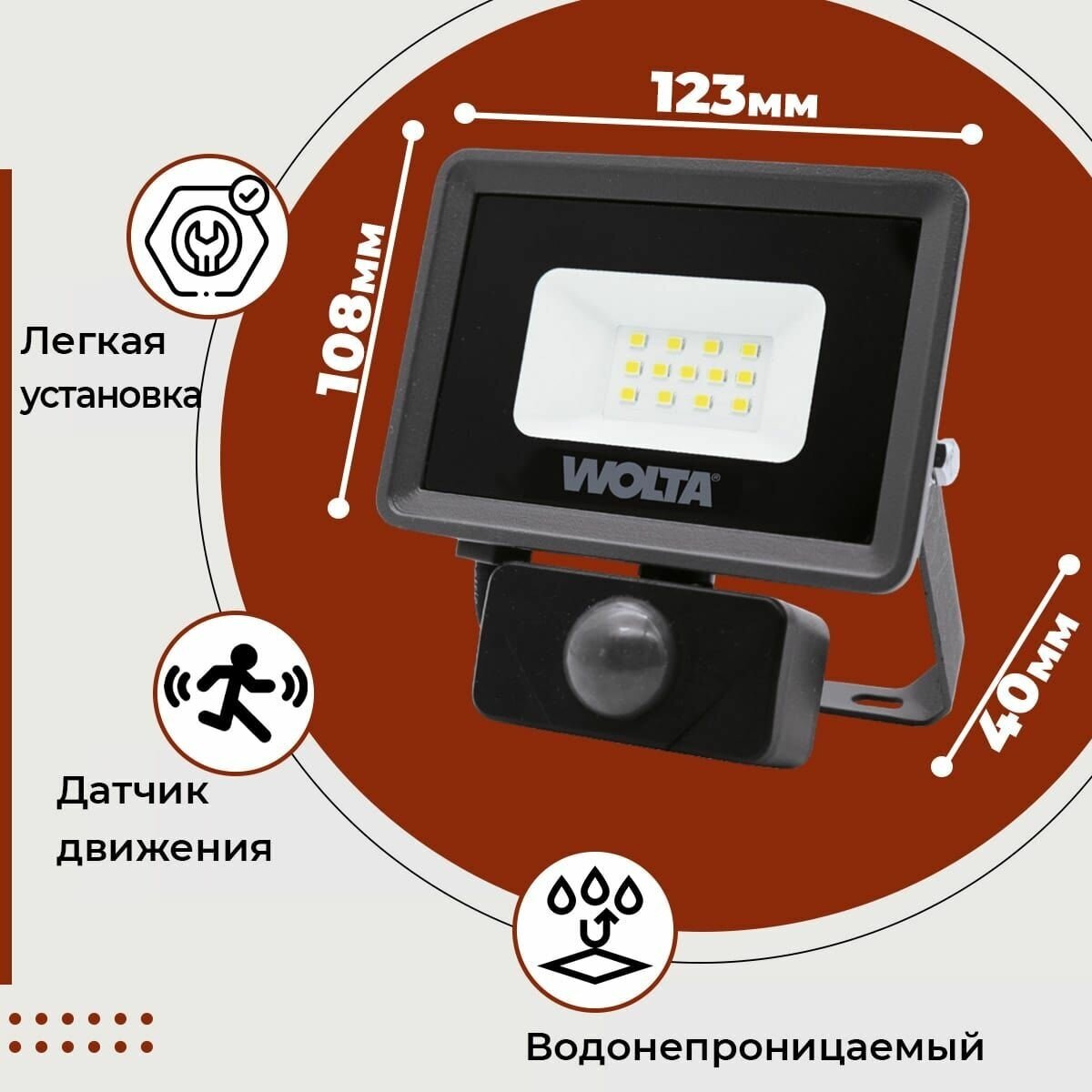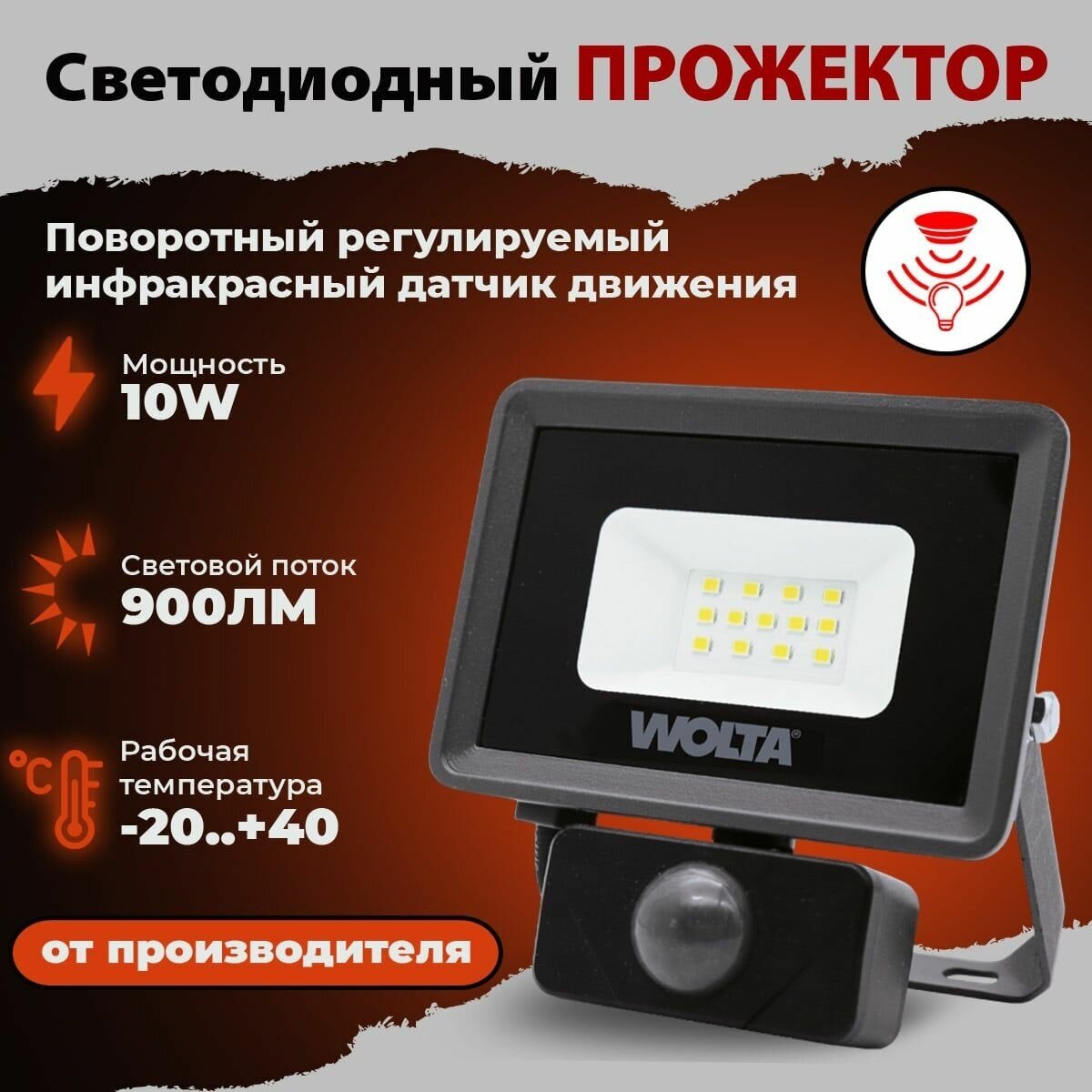 Прожектор светодиодный Wolta WFL-06s с датчиком, 10Вт, 5700K, 900Лм, IP65