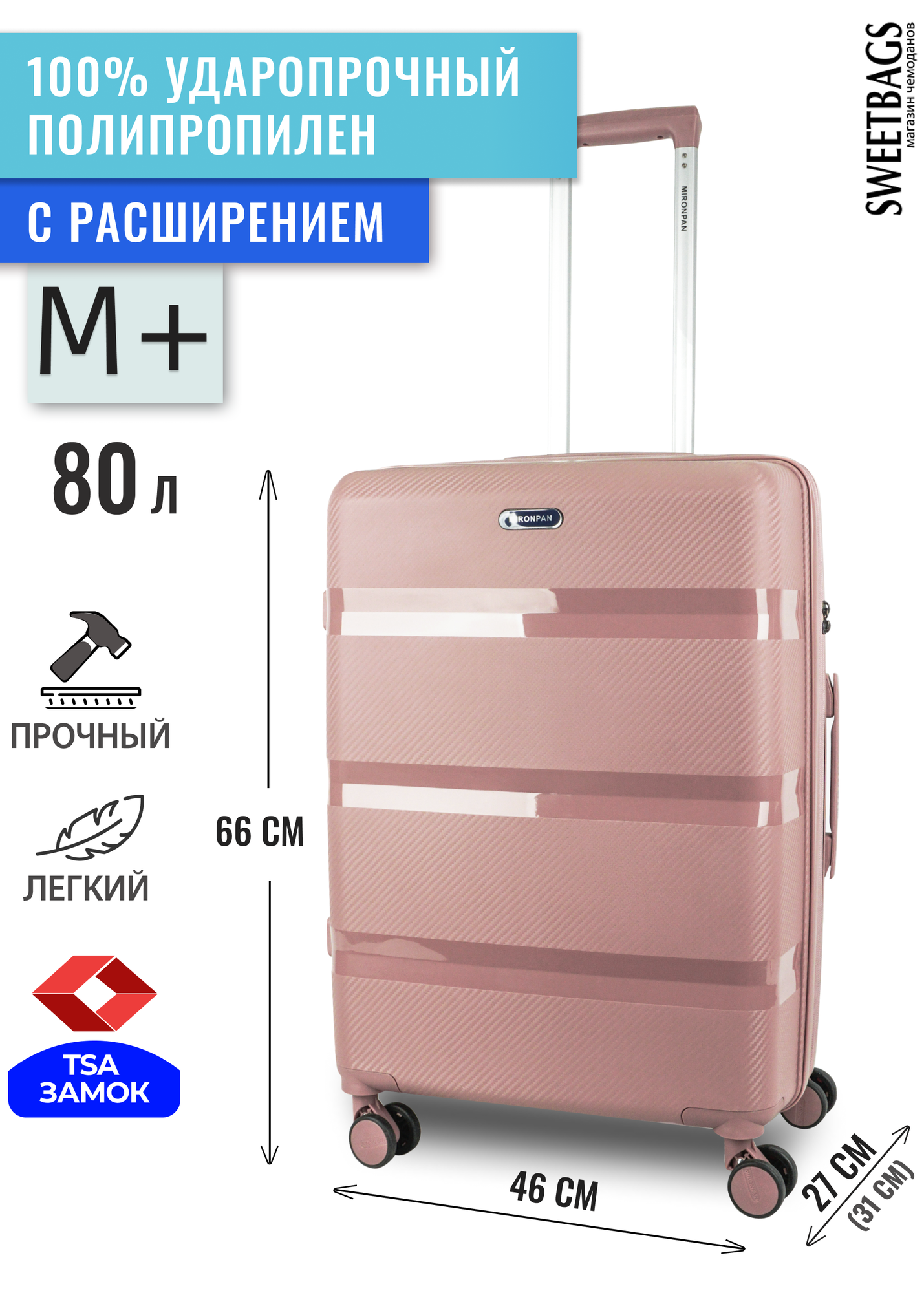 СохранитьЧемодан Sweetbags средний из полипропилена с расширением на 4-х колесах с TSA замком (3 гориз. полосы) чайная роза M+ интересное: