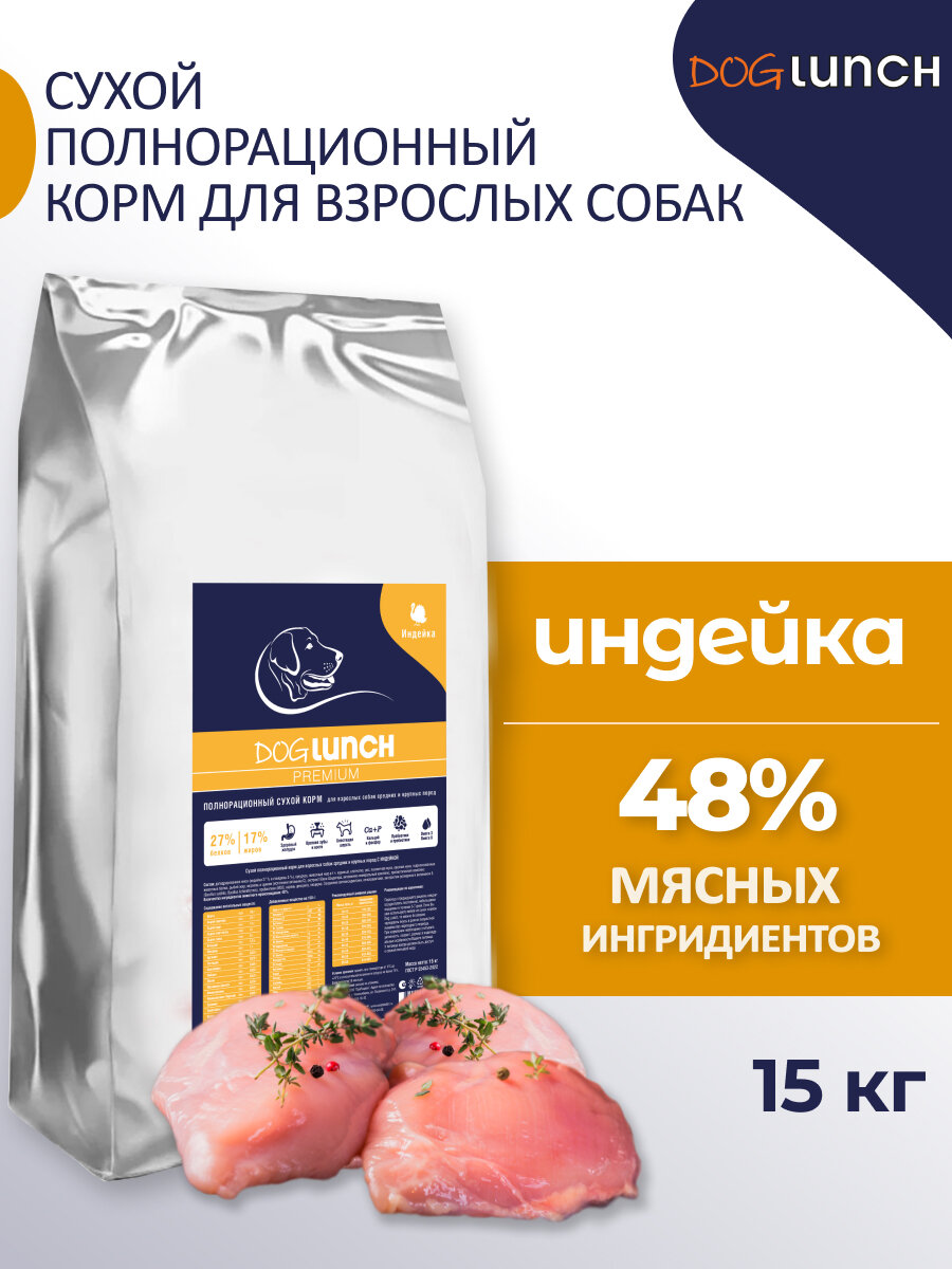 Сухой полнорационный корм для взрослых собак средних и крупных пород DogLunch Premium с индейкой 15кг