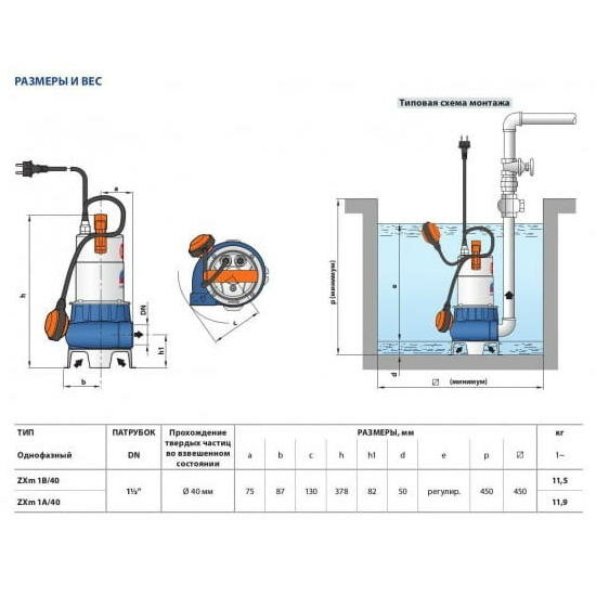 Насос дренажный Pedrollo ZXm 1A/40 - 0,60 кВт (1x230 В, Qmax 400 л/мин, Hmax 10,5 м, кабель 5 м)