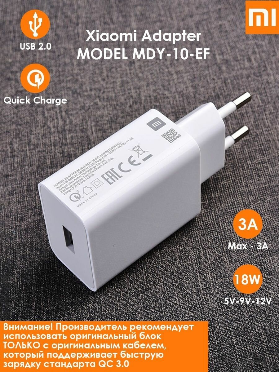 Сетевой адаптер 18W/3А совместим с Xiaomi mdy-10-ef с USB входом Quick Charge 3.0