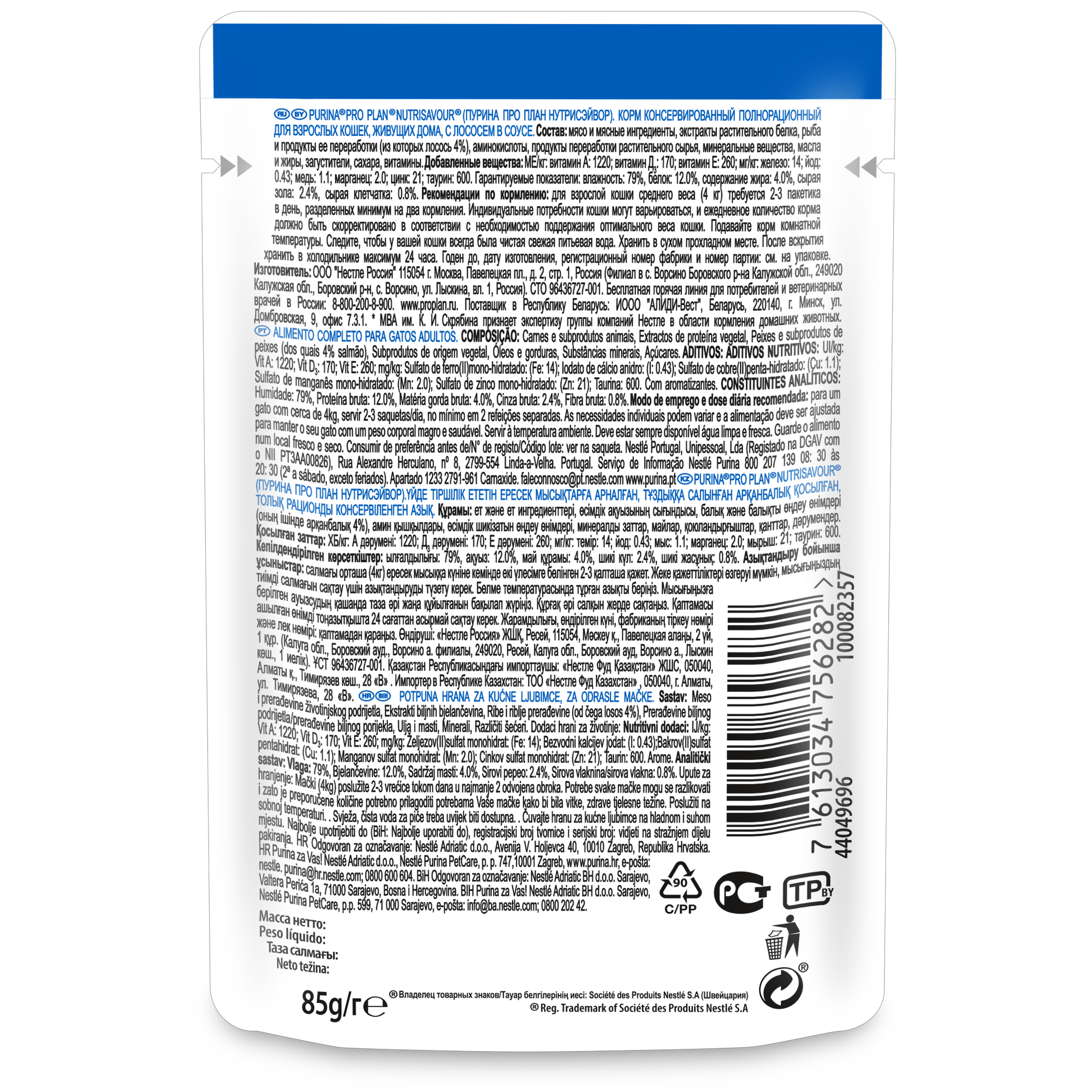 Влажный корм PRO PLAN для домашних кошек, лосось в соусе, пауч, 85 г