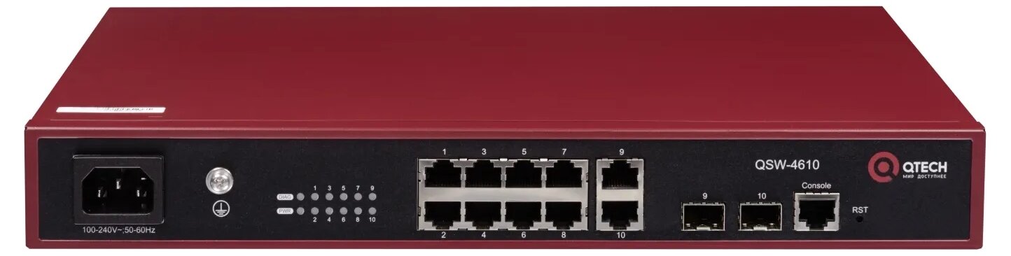 Управляемый коммутатор уровня L2+ Qtech QSW-4610-10T-AC встроенный БП разъем питания на передней панели, 100-240В AC