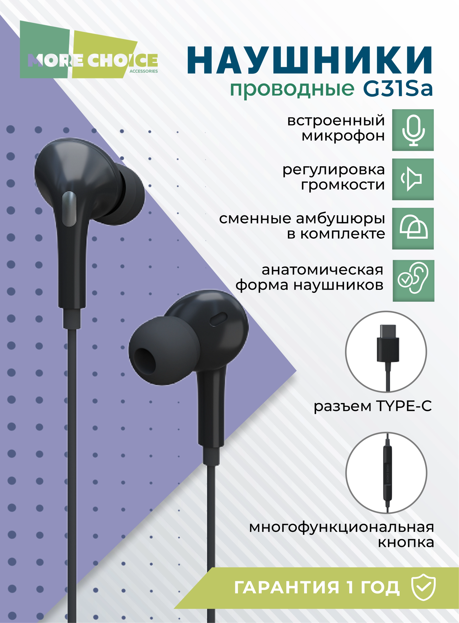 Наушники More choice G31Sa вакуумные Type-C разъём с микрофоном и рег.громкости длина 1.2м черный