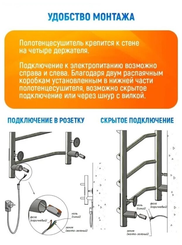 | Дополнительная информация | полотенцесушитель, телескопический держатель - 4 шт., паспорт изделия, телескопический держатель - 4 шт.; нагревательный кабель; шнур электропитания с вилкой и кнопкой включения |