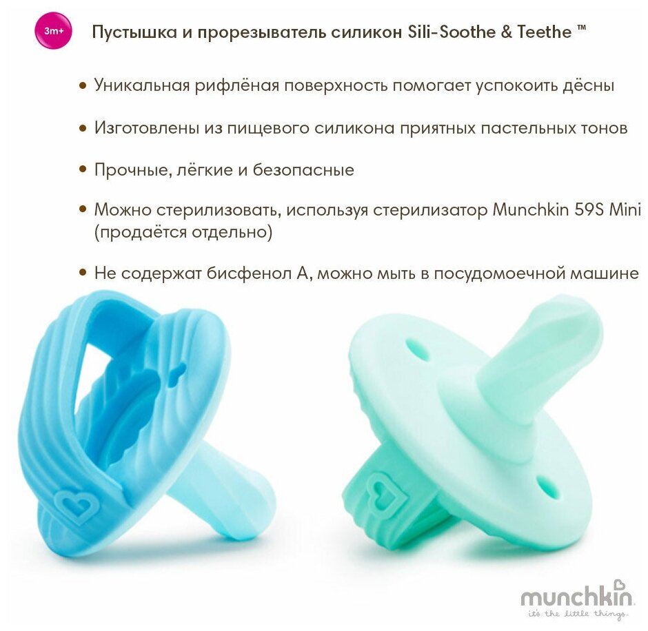 Пустышка-Прорезыватель MUNCHKIN Sili-Soothe & Teethe Силиконовый голубой-мятный 2 шт 3+ мес интересное: