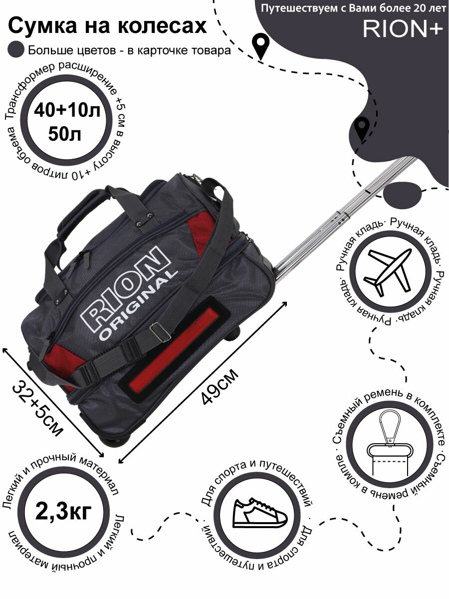 СохранитьДорожная сумка на колесах Рион+ (RION+) для путешествий и спорта R143, 40 литров, укрепленная (до 25кг), водоотталкивающая ткань, серый интересное: