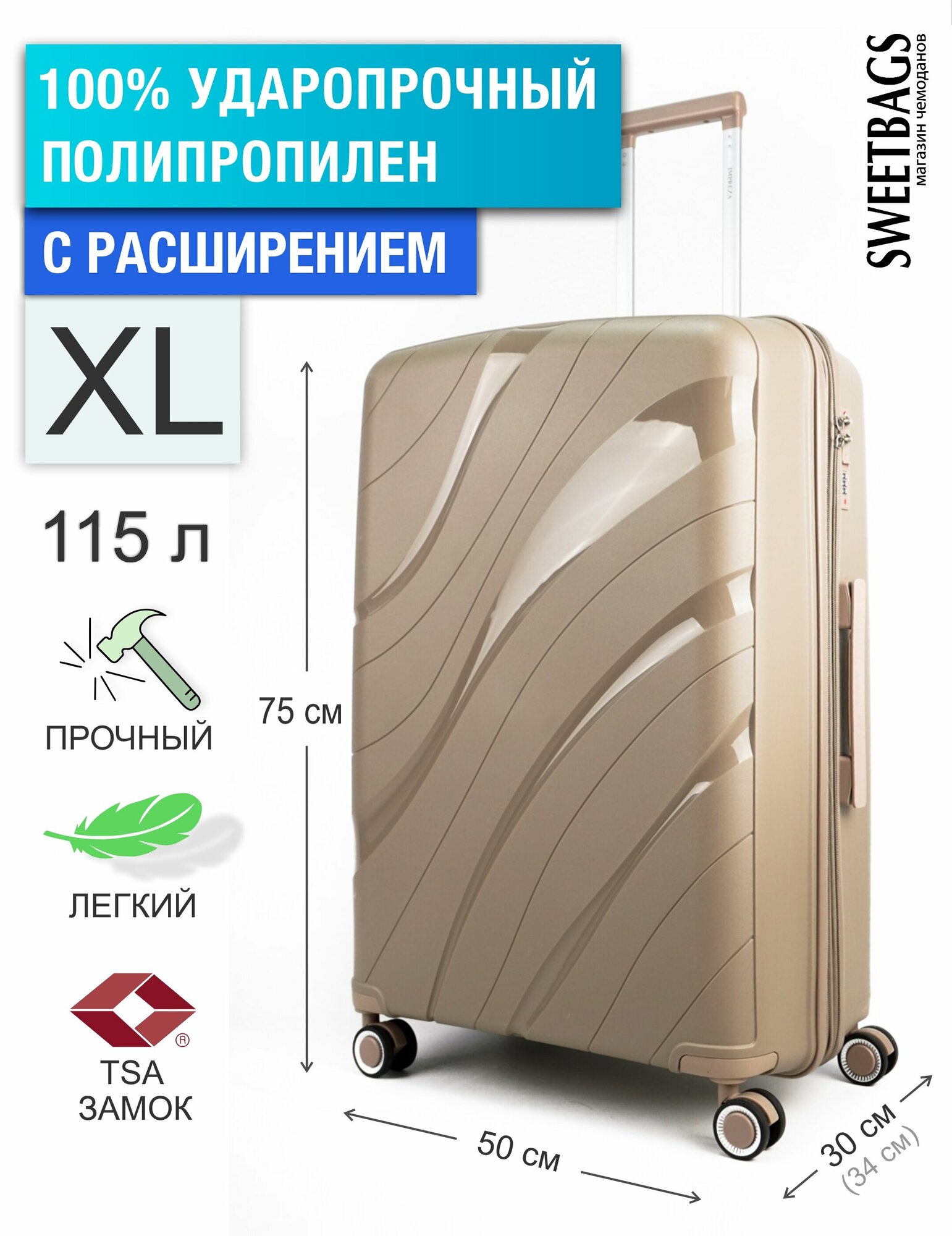 СохранитьЧемодан Sweetbags большой из полипропилена с расширением на 4-х колесах с TSA замком (волны) песочный XL интересное: