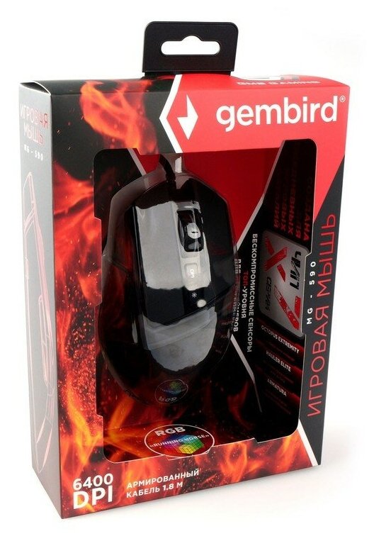Мышь игровая Gembird MG-590, USB, чёрн, 6400DPI, 7 кн., RGB, армир. каб, 1.8 м