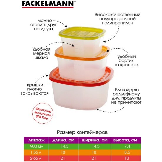 Контейнер пищевой с крышкой FACKELMANN, набор 3 штуки, объем 900 мл, 500 мл, 230 мл, хранение, разогрев в СВЧ, заморозка, сервировка