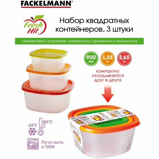 Контейнер пищевой с крышкой FACKELMANN Fresh HIT, набор 3 штуки, объем 2,65 л, 1,55 л, 900 мл, хранение
