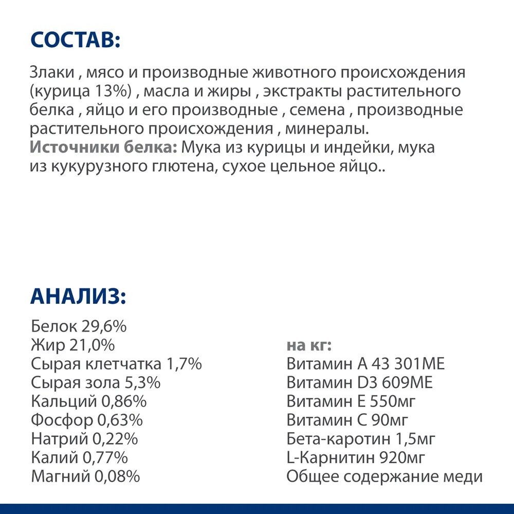 | Дополнительная информация | источники протеина: Мука из курицы и индейки, мука из кукурузного глютена, сухое цельное яйцо |