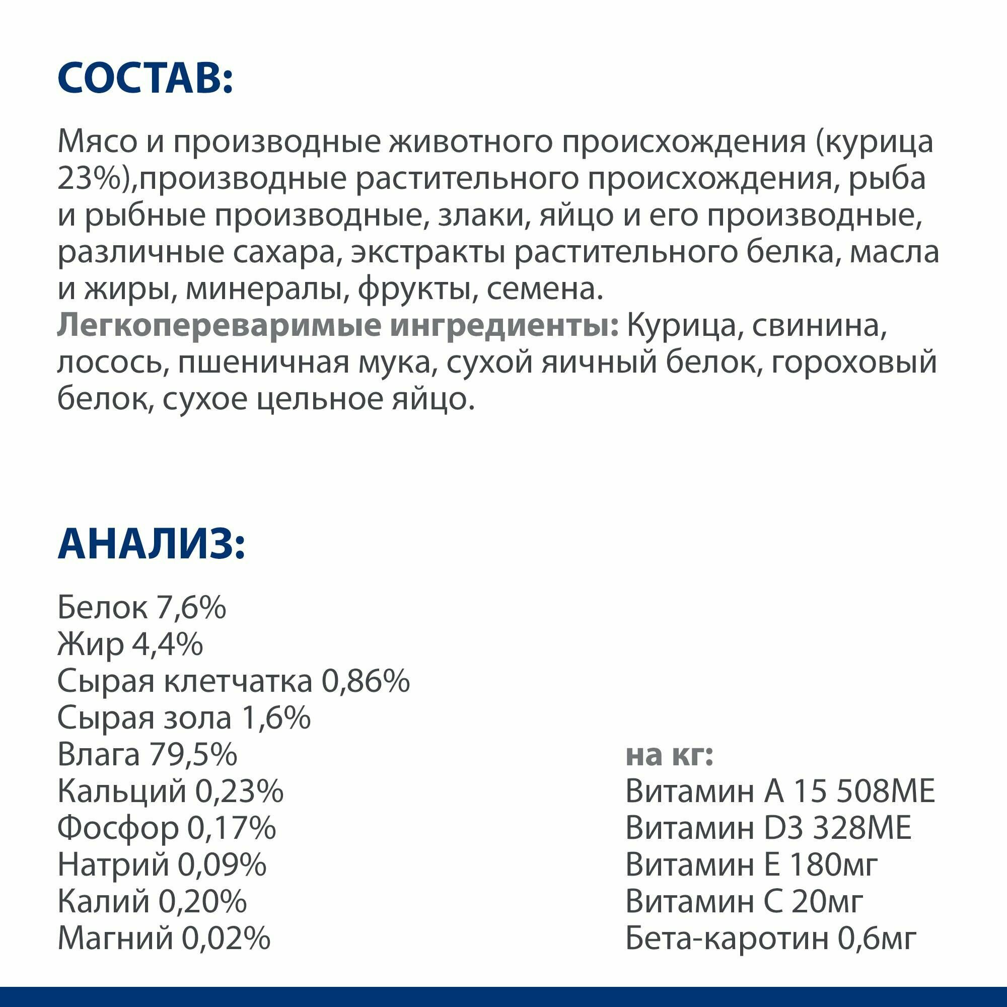 | Состав | мясо и производные животного происхождения (курица 23%), производные растительного происхождения, рыба и рыбные производные, злаки, яйцо и его производные, различные сахара, экстракты растительного белка, масла и жиры, минералы, фрукты, семена. Легкопереваримые ингредиенты: курица, свинина, лосось, пшеничная мука, сухой яичный белок, гороховый белок, сухое цельное яйцо |