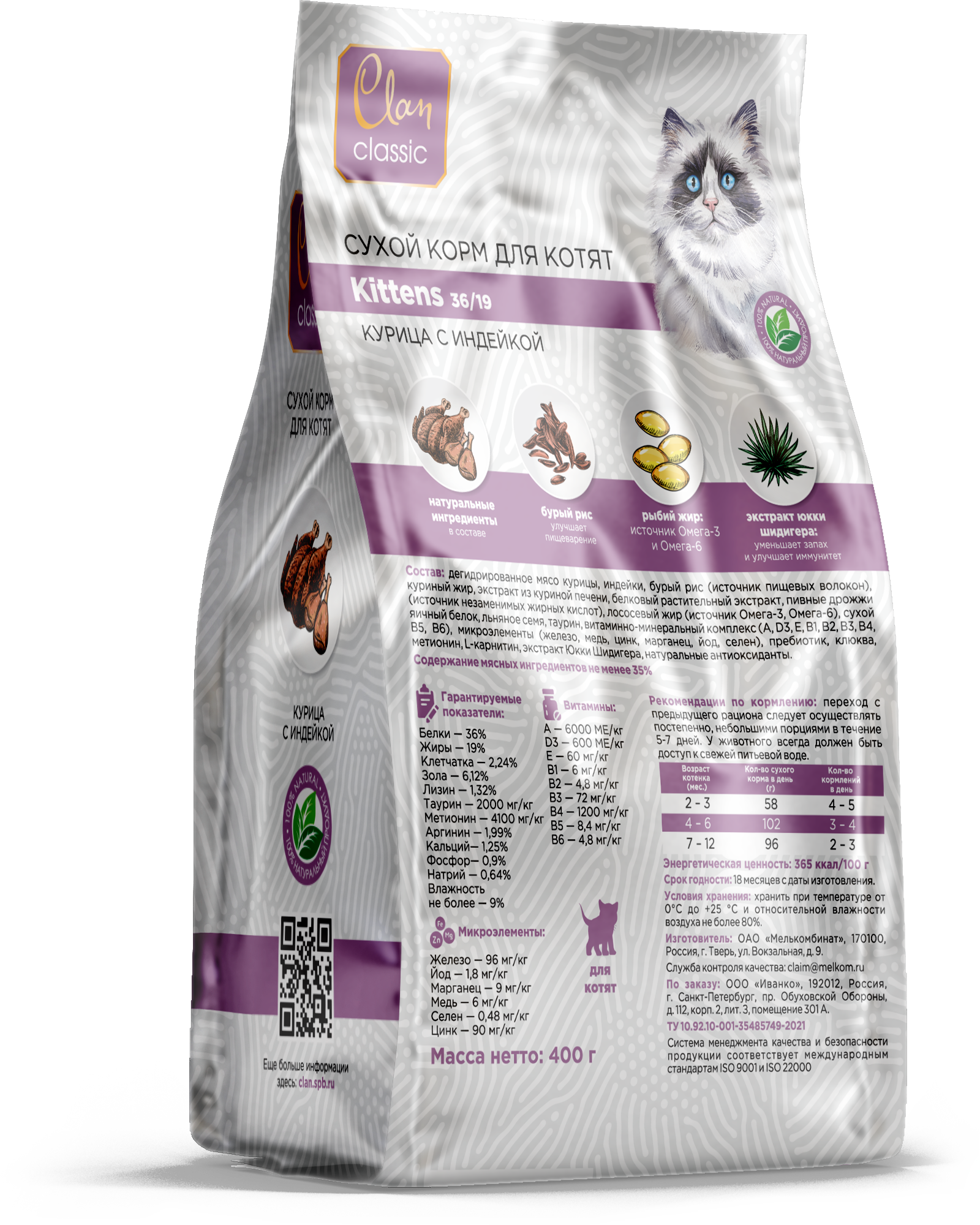 CLAN CLASSIC Kittens 36/19 корм сухой для котят Курица с Индейкой 400г