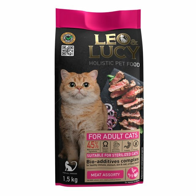 Сухой холистик корм Leo&Lucy полнорационный для взрослых кошек мясное ассорти и биодобавками, подходит для стерилизованных, 1,5 кг