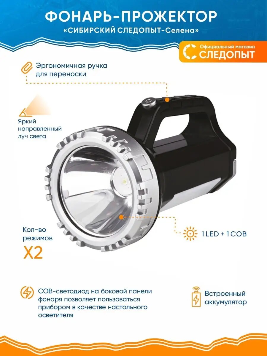 Фонарь прожектор аккумуляторный светодиодный "сибирский следопыт-селена", 1 LED + 1 COB
