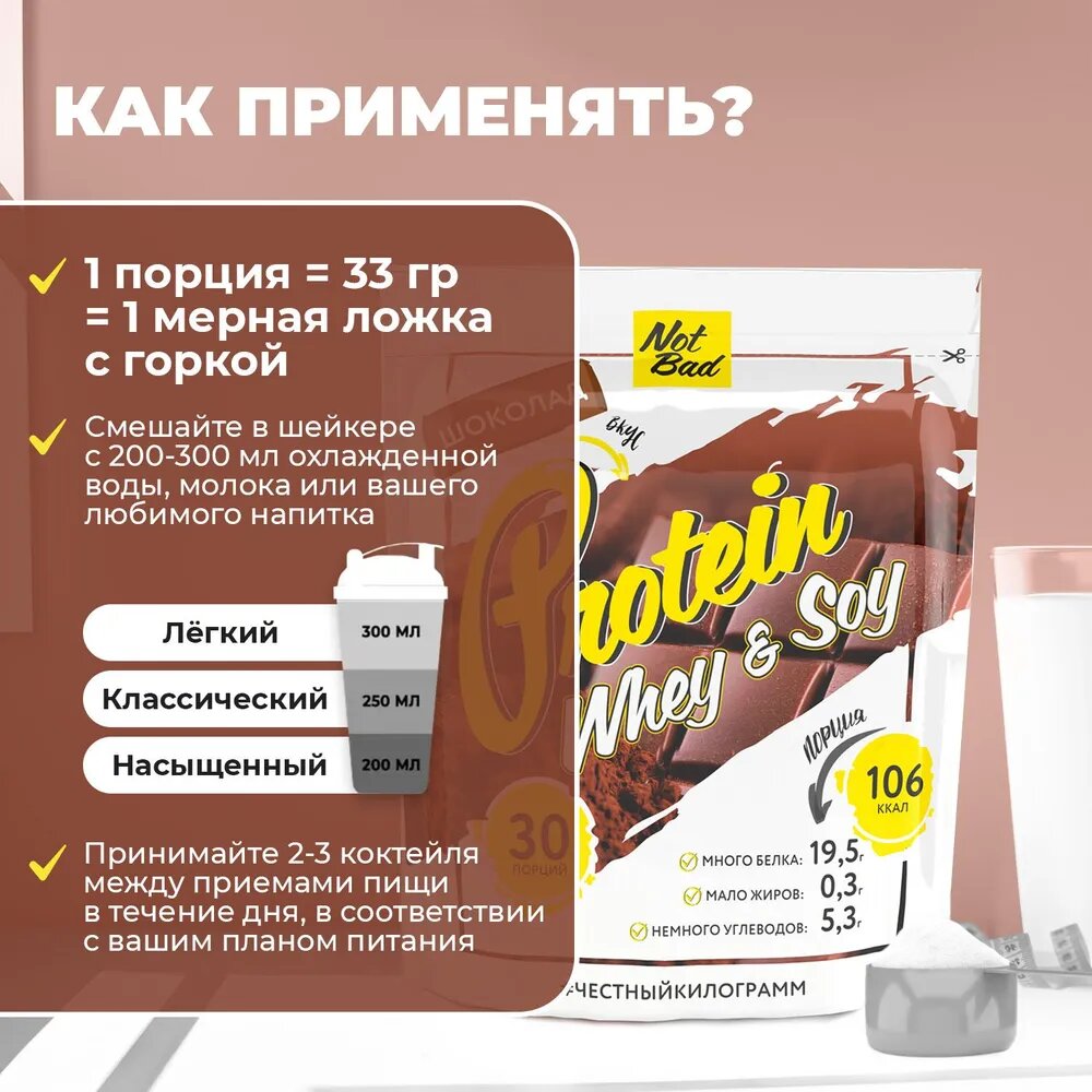 Протеин соевый + сывороточный NotBad многофункциональный коктейль Whey & Soy, 1000 гр, вкус Шоколад