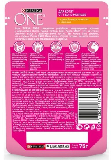 Влажный корм Purina One для котят, курица с морковью, пауч, 75 г*26 шт