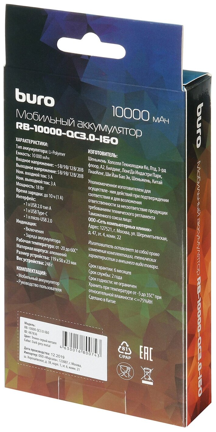 Внешний аккумулятор Buro RB-10000-QC3.0-I&O Grey интересное: