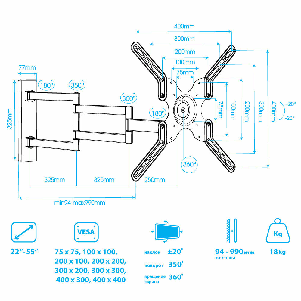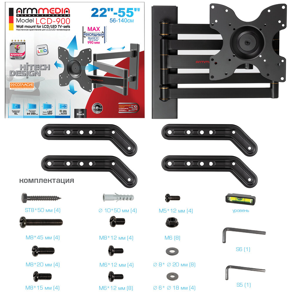 Arm Media LCD-900 кронштейн для ТВ 22"-55", расстояние от стены 94-990 мм интересное: